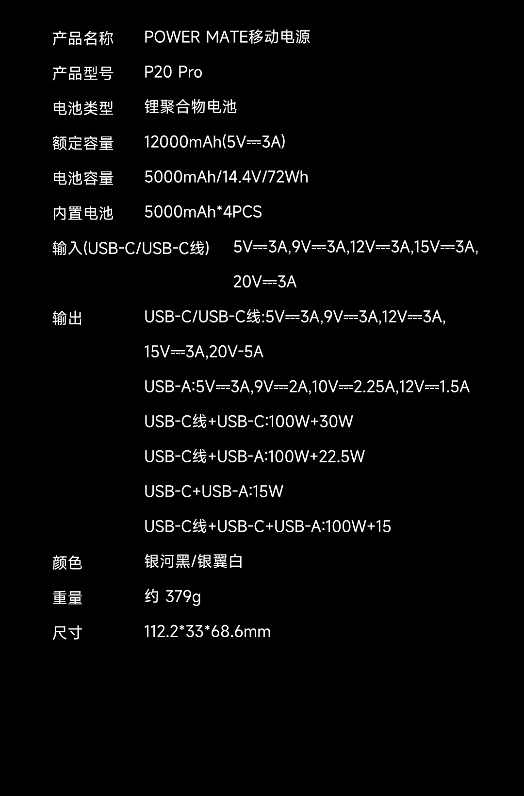 输入(USB-C/USB-C线):5V-3A,9V-3A,12V-3A,15V-3A.20V-3A